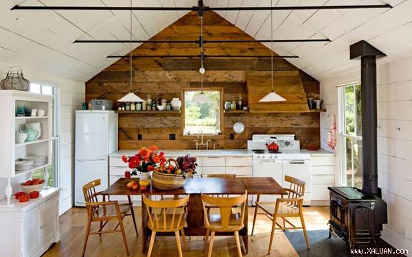 Phòng ăn ấm cúng và xinh xắn với bàn ăn cỡ lớn, bàn bếp chữ I tích hợp đầy đủ dụng cụ nấu nướng hiện đại. Trong căn phòng này, mảng tường gỗ nguyên bản nổi bật trên nên tường, sàn trắng còn được xem là một điểm nhấn đẹp mắt.